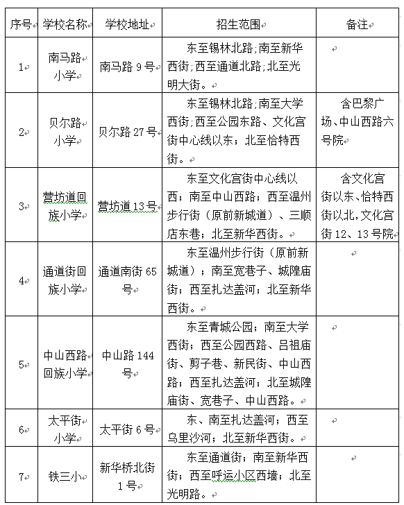 2017年回民区小学招生划片范围表