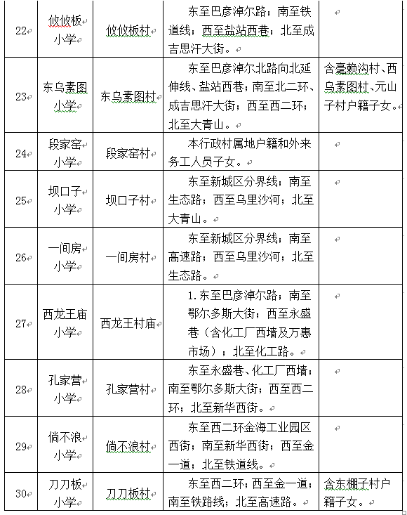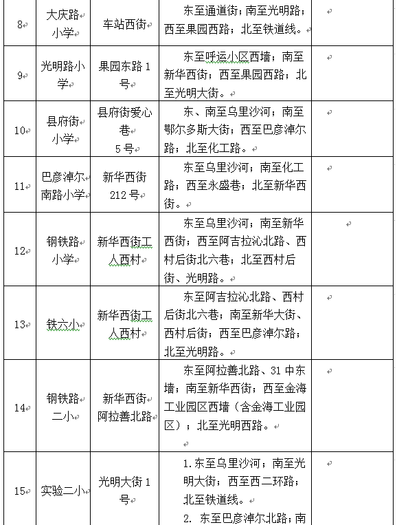 公义店小学:南柴火市街以南,南柴火市街南巷以西,鄂尔多斯路以北,前后八里以东,扎达盖河以西,南二环以北。