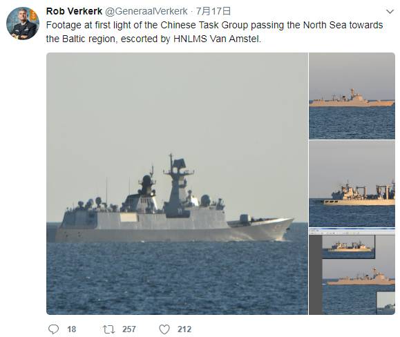 ▲荷兰海军军官费尔凯克在个人推特发布中国军舰在通过荷兰水域的照片。