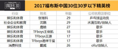 中新网7月21日电 2017年7月20日,福布斯中国在深圳举行新闻发布会公布了2017年中国“30位30岁以下精英”榜单(以下简称30U30)。著名乒乓球运动员张继科,亚洲人气歌手、演员鹿晗,新时代偶像TFboys,水滴筹、水滴互助创始人沈鹏、ofo创始人戴威等,凭借在各自领域的出色表现脱颖而出进入榜单。