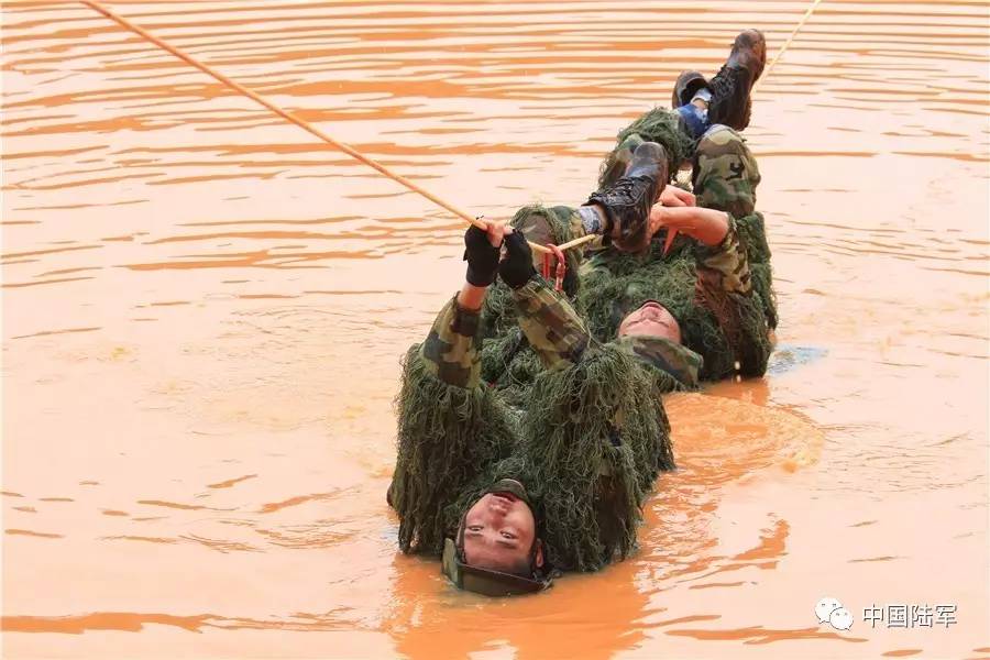▲2015年8月28日在云安马龙丛林驻训,两栖侦察队组织官兵进行“蛙人”牵引横渡 尚文斌摄