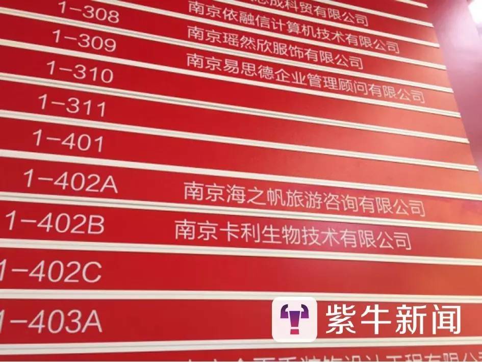 7月20号,紫牛新闻记者按照沈女士提供的地址来到南京市创意园东八区一栋402A室,不过这里并没有“江苏金色假日国际旅行社有限公司”的招牌,通过一楼的指引牌可以看出,同一地址标注的是“南京海之帆旅游咨询有限公司”。