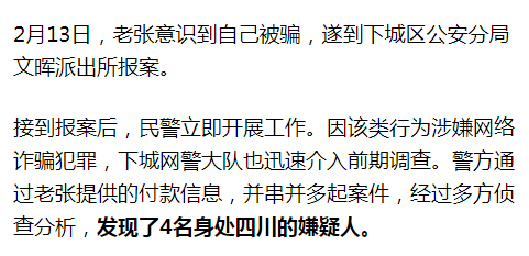 经审查,该三名嫌疑人对诈骗一事供认不讳,现已被下城文晖派出所刑事拘留。另一嫌疑人尹某波仍在上网追逃中。