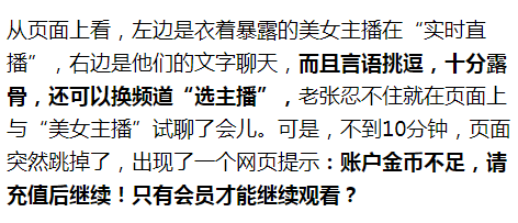 网页上的主播画面似乎都没怎变么,怎么看起来像是事先录制好的?而且,说好的“一对一裸聊”呢?人影都没见着!于是,按照网页上的说明,老张想到了退款...