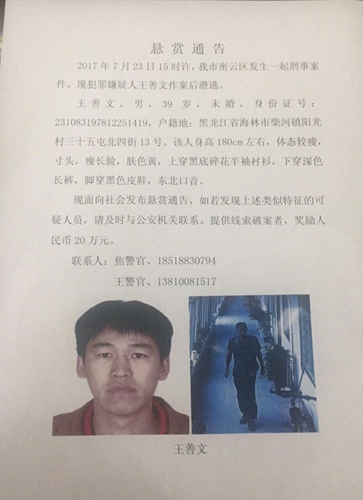 今日中午,北京密云警方发布线索征集通告称,嫌疑人王善文,38岁,未婚,黑龙江省海林市人,身高180cm左右,体态较瘦,寸头,瘦长脸,肤色黄,上穿黑衣碎花半袖衬衫,下穿深色长裤,脚穿黑色皮鞋,东北口音。对提供线索抓获犯罪嫌疑人的,公安机关奖励20万元。