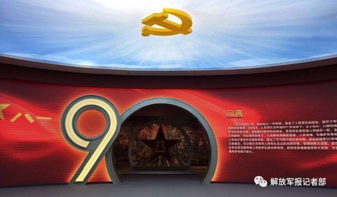 23日上午,记者随武警北京市总队500余名官兵一起步入展厅,迎面而来的是一个巨大的“90”标志,其中的“0”被巧妙地设计成一道椭圆形拱门,门内的八一军徽熠熠生辉。