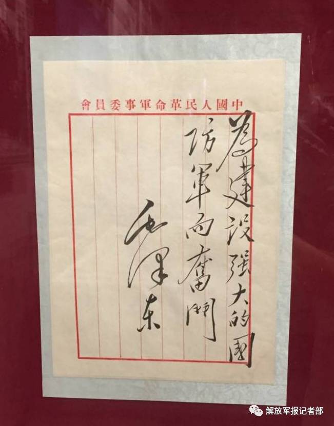 毛泽东书写的“为建设强大的国防军而奋斗”题词。记者徐小龙 摄