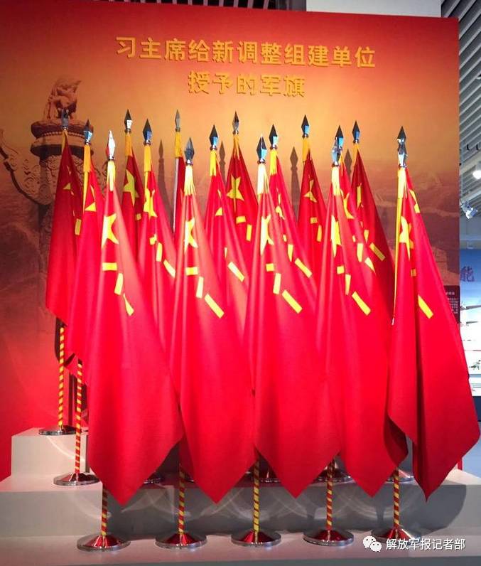 临近出口,火红一片,吸引着每位观众的目光,这是2015年以来习主席陆续授予新调整组建单位的17面军旗。