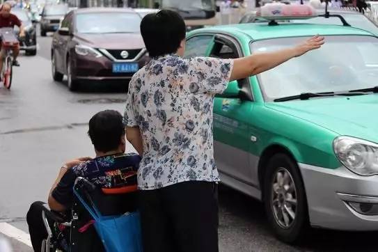 老爷爷坐在轮椅上,老奶奶一只手推着轮椅,一只手扬起拦出租车,等了好几分钟,拦了几辆车也没有车主愿意搭载。 新快报记者 祝贺/摄