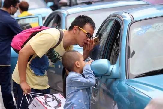 ■一位小朋友扒在倒后镜前等待司机“提问”完后开门上车。