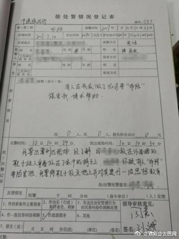 4、110吗?赶紧来我家破阵 因为门外晒的鞋子不知被谁放到了凳子上,安徽宁国的涂某报警称有人摆了阵法在害他,并要蜀黍“破阵”解救中溪派出所民警到场后将鞋子挪到地上,“破解了阵法”。(@宁国公安在线)