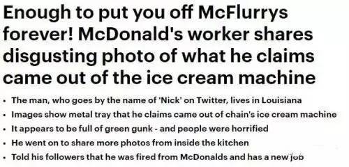 美国麦当劳一家餐厅的冰淇淋机,被一实习生指责严重发霉。