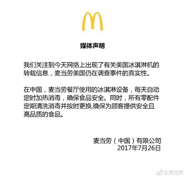 7月26日23时许,麦当劳官方微博发布了《关于美国冰淇淋机的媒体声明》:“我们关注到今天网络上出现了有关美国冰淇淋机的转载信息,麦当劳美国仍在调查事件的真实性。在中国,麦当劳餐厅使用的冰淇淋设备,每天自动定时加热消毒,确保食品安全。同时,所有零配件定期清洗消毒并按时更换,确保为顾客提供安全且高品质的食品。”