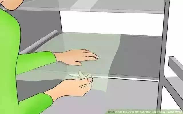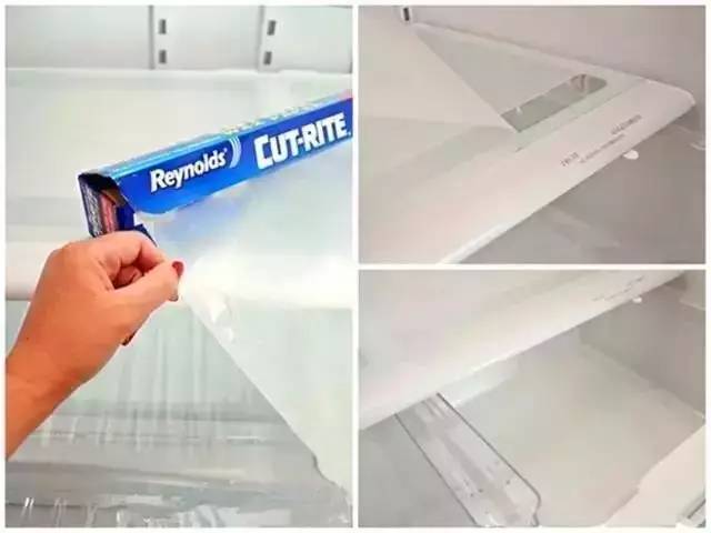 冰箱里的食物有时候沾满油或不小心洒出牛奶和果汁,清洗起来很麻烦,可以在上面垫一层保鲜膜。