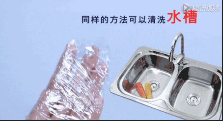 摘掉手套,套上保鲜膜,搭配柠檬皮或柠檬汁,轻轻松松将洗水槽边角难洗的油渍都去除了~