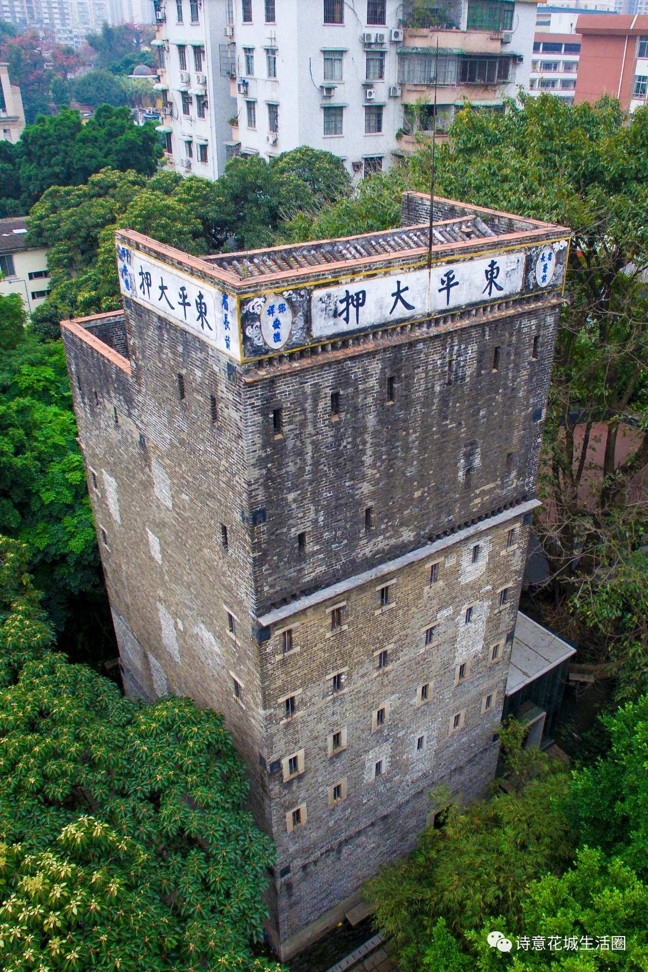 拔地而起的碉楼状建筑抢占了低矮楼房画面的制高点,坚固的墙身透视内藏乾坤。这里一度是判断广州的地标建筑。
