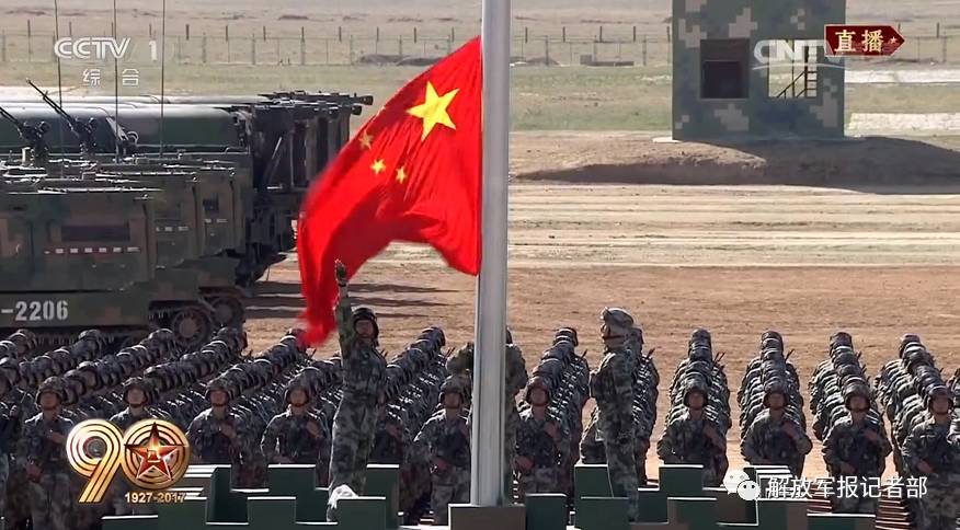 军报记者朱日和7月30日电(记者王士彬、安普忠)回顾建军历史,传承红色基因,坚定维护核心,彰显辉煌成就。上午9时许,中共中央总书记、国家主席、中央军委主席习近平走上检阅台。全场伫立高唱国歌,鲜艳的五星红旗冉冉升起,在演兵场上空迎风飘扬。