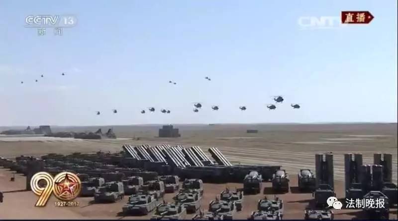 纪念标识梯队精彩亮相,17架直升机组成"八一"标识,24架直升机绘出"90"字样,象征着人民军队走过了90年光辉历程。