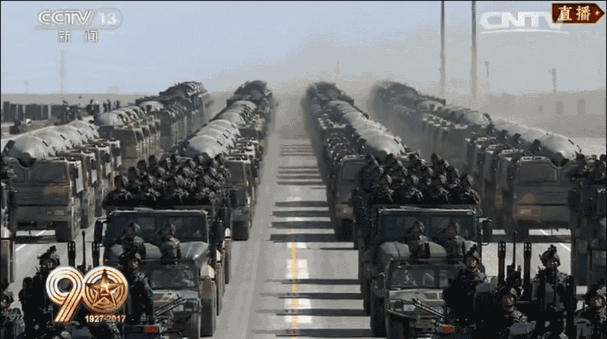 由常规导弹、核导弹、核常兼备导弹组成的战略打击群,以雷霆万钧之势最后通过检阅台。(央视新闻)