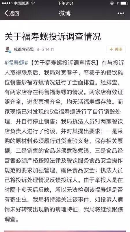 最后,补充一则新消息,成都市食药监局查证后,发现成都宽窄巷子确实有两家摊位存在销售福寿螺的情况。