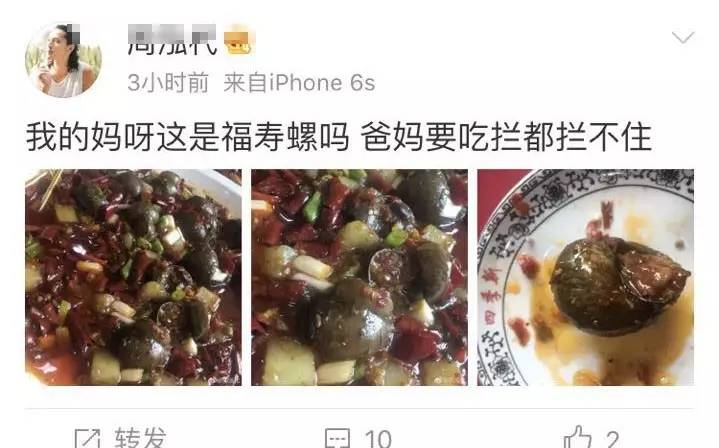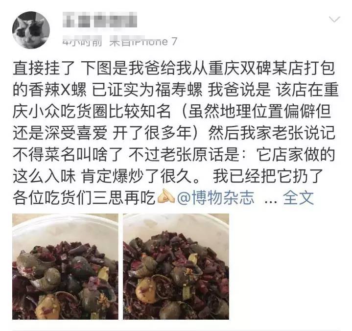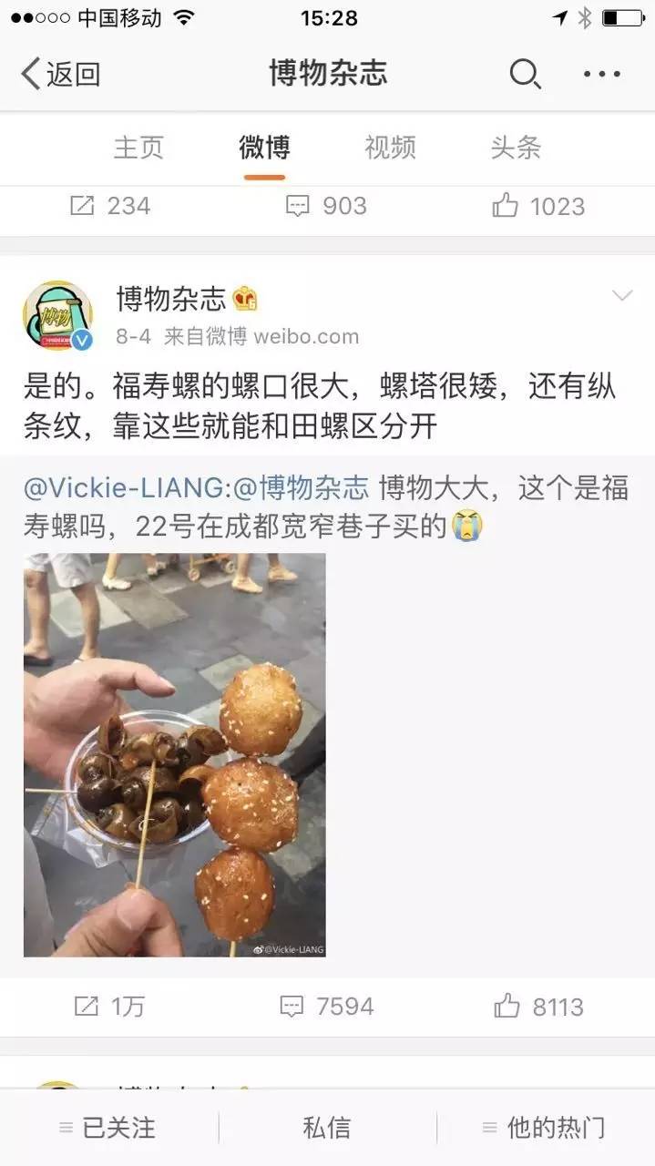 话虽如此,但一些黑心商家为了利益,会冒险用福寿螺冒充田螺出售。就在两天前,博物杂志的官方微博,鉴定一位网友在成都宽窄巷子买的“爆炒田螺”实际为福寿螺。