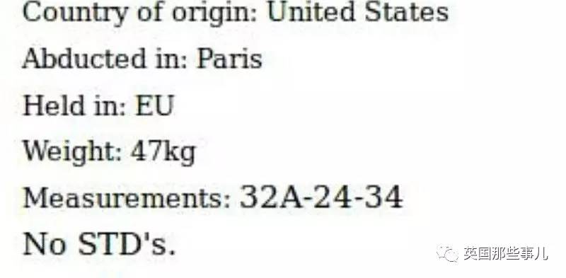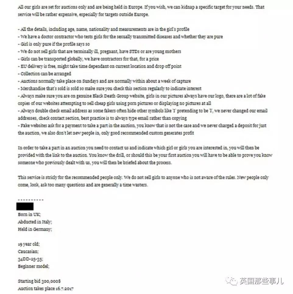 “出生在英国的模特,在意大利绑架,目前关押在德国,19岁,白人,34DD-25-35。 拍卖日期:2017年7月16日“
