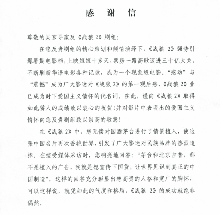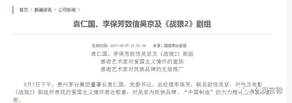 茅台方面反映可谓相当迅速。8月7日下午,贵州茅台集团董事长袁仁国,党委书记、总经理李保芳,联名致信吴京,对他及电影《战狼2》剧组所表现的爱国主义情怀表达敬意,对吴京为民族品牌、“中国制造”的大力推介表示衷心感谢。