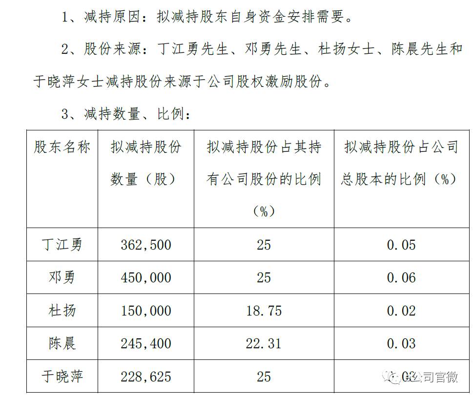 公司董事丁江勇、副总裁邓勇、副总裁杜扬、副总裁兼董事会秘书陈晨、财务总监于晓萍于8月7日向公司提交《股份减持计划告知函》,拟在公告披露之日起15个交易日后的6个月内,减持公司股份合计不超过143.65万股(占公司总股本0.1978%)。减持原因显示为“自身资金安排需要”。