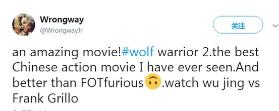 “战狼2电影太赞了,是我看过最好的中国动作片,比速度与激情好看多了。快看吴京和Frank Grillo对打”