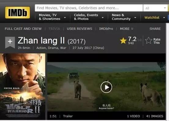 在全球最大的电影数据库IMBd上,《战狼2》综合评分7.2分。