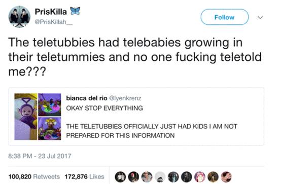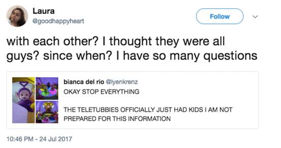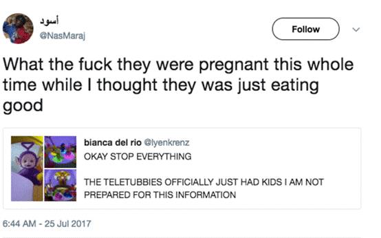 “天线宝宝用他们的天线胃生了天线宝宝宝宝??然后还没人告诉我一声??”