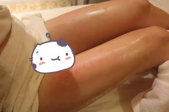 才做2~3分钟,Sophia背上就很明显地出现了一道道“红线”。如果湿气越重,出痧就会越明显!听说这位美女理疗师是从中医院校毕业的,所以手法很专业,每一处都按到穴位上。背部做完就是手臂、腹部,大腿各个部位逐一手法疏通经络。