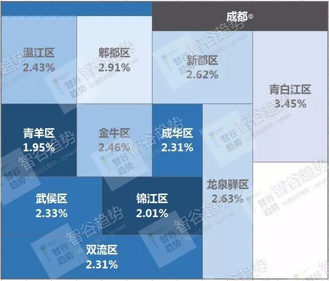 ⑦ 成都:各城区数值普遍均匀的“平原分布”。