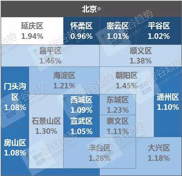 然而,北京的情况却非如此。其租金最低的区域出现在怀柔,低于1%。而且密云区、平谷区、门头沟区和房山区也处于低位,甚至比五环以内的西城区还低。反观北京城中心的几个区,海淀、朝阳、东城和丰台的租金回报率都处在相对于外围的大部分区域更高的水平。