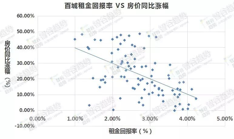 (从图中的坐标点分布可以看出,租金回报率越低房价涨幅越高)