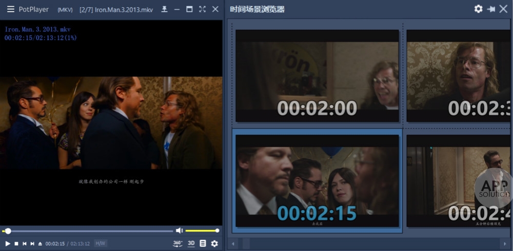 仅仅鼠标就能有如此多的快捷操作,再加上 PotPlayer 支持 触摸屏、Xbox 手柄控制,操控方式可以说无比强大,随心所欲,一键即达,十分便捷。 定位精确、逐帧进退 PotPlayer 对视频的跳转定位十分友好,除了 自定义任意快进的秒数,还有 时间场景浏览器供你预览预设时间间隔的画面,快速找到你想要的部分。 按 F 和 D 还能逐帧进退,截个图不用左调右调,能优雅定位。 更为逆天的是, PotPlayer 可以跳转至上一句、下一句对白!