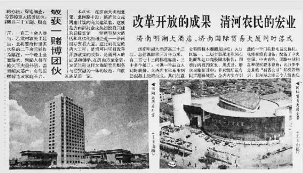 1990年5月,有关媒体曾对明湖大酒店的落成做了相关报道文中写到在济南大明湖北邻、北园路中段,新近耸立起两座壮观的高大建筑物,这便是济南清河企业集团投资兴建的高级宾馆——济南明湖大酒店和现代化流通企业——济南国际贸易大厦,这比肩而立的两大工程,是清河村坚持改革开放政策的成果。在济南乃至全省,农民兴建这样大而配套的服务与经贸题为一体的设施,目前还是第一家。酒店还配备了中央空调、中央音响等设施。