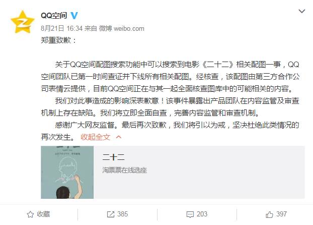 8月21日下午,QQ空间通过其官方微博就此事发布道歉声明。声明称,关于QQ空间配图搜索功能中可以搜索到电影《二十二》相关配图一事,QQ空间团队已第一时间查证并下线所有相关配图。经核查,该配图由第三方合作公司“表情云”提供,目前QQ空间正在与其一起全面核查图库中可能相关的内容。