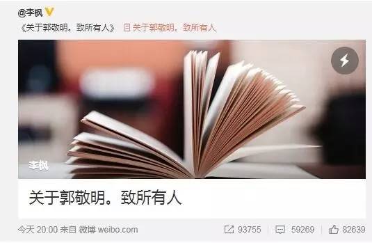 8月21日晚上,作家李枫写了一封《关于郭敬明致所有人》的公开信,爆料曾遭郭敬明同性性骚扰。