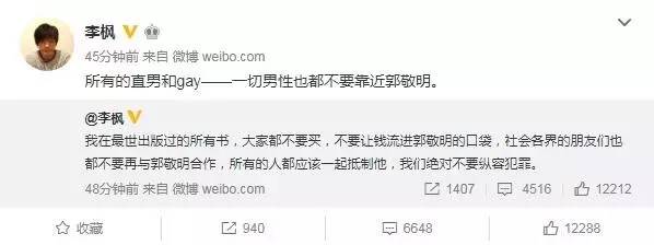 李枫发表完长文后,又随即在微博称:“我在最世出版过的所有书,大家都不要买,不要让钱流进郭敬明的口袋,社会各界的朋友们也都不要再与郭敬明合作,所有的人都应该一起抵制他,我们绝对不要纵容犯罪。”、“所有的直男和gay——一切男性也都不要靠近郭敬明。”