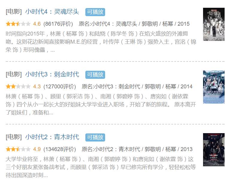 有了第一部《小时代》在票房上的成功,在随后的三年间,郭敬明与和力辰光、乐视影业一起推出了小时代四部曲中剩下的三部,据时光网报道,《小时代》系列电影累计票房高达17.9亿元。