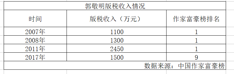 每经小编(微信号:nbdnews)了解到,今年4月发布的2017年作家富豪榜上,自2014年就未出书的郭敬明,依然以1500万元的版税收入位居第九名。而公开资料显示,在2007年、2008年、2011年,郭敬明分别以1100万、1300万、2450万元的版税收入在当年排行榜上位居第一。
