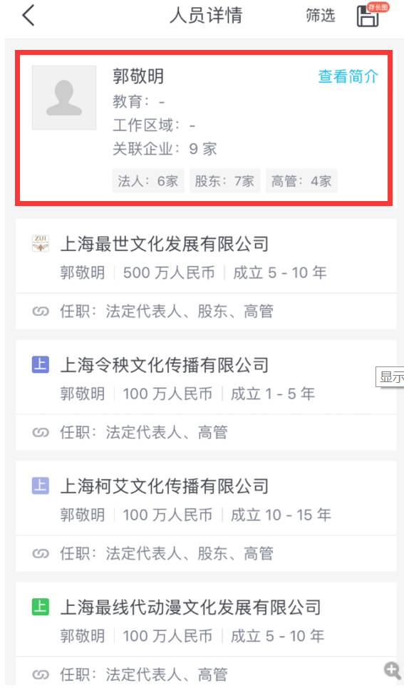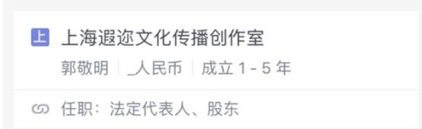 来自启信宝的数据显示,郭敬明目前是5家公司的法人代表(注:上海双子蕙兰文化创作室已注销),并担任4家公司高管。