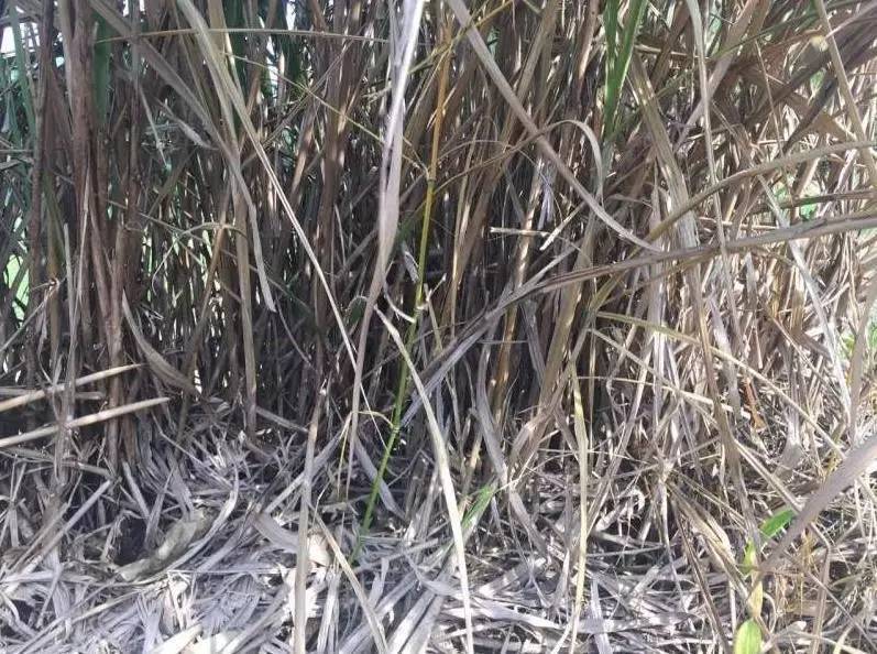 上图:使用傲杀除草剂一周后的芒草,从根部腐烂死亡,叶片枯黄。