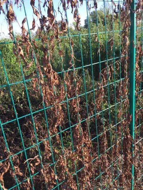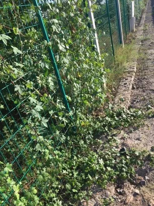 上图:夏季使用傲杀除草剂前,铁路护网上生长缠绕的葎草(拉拉秧)。