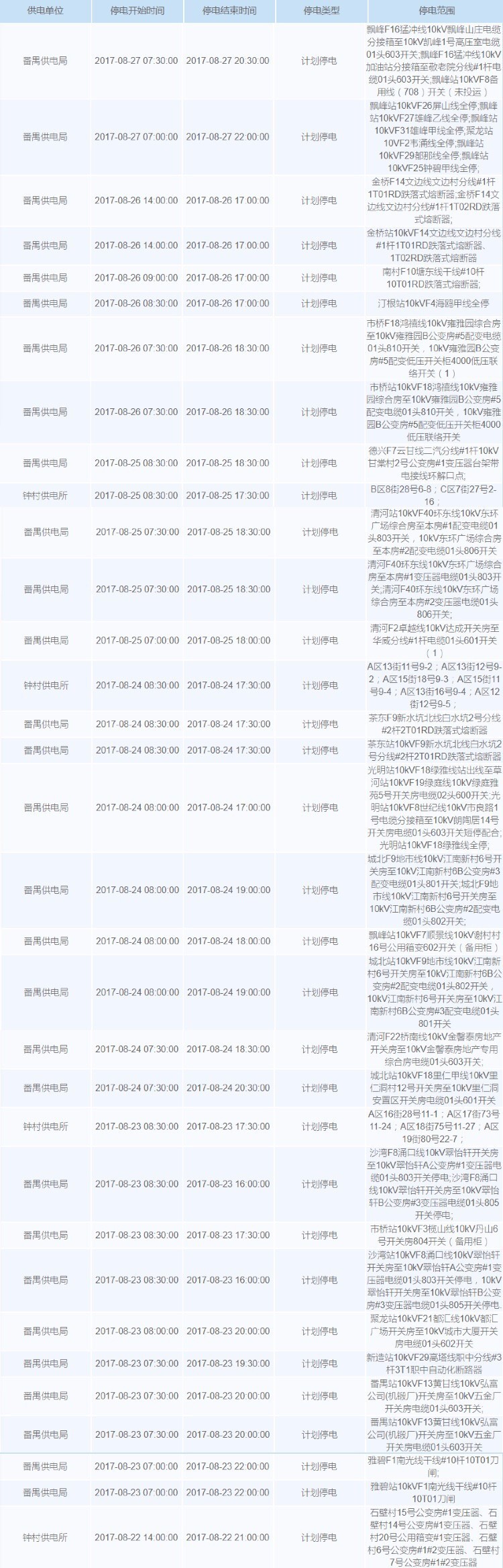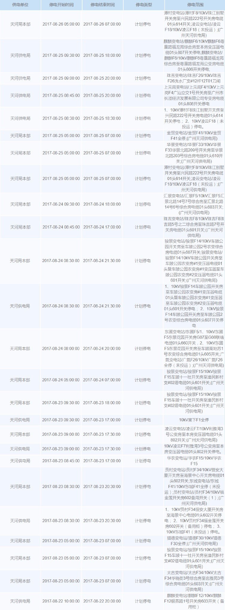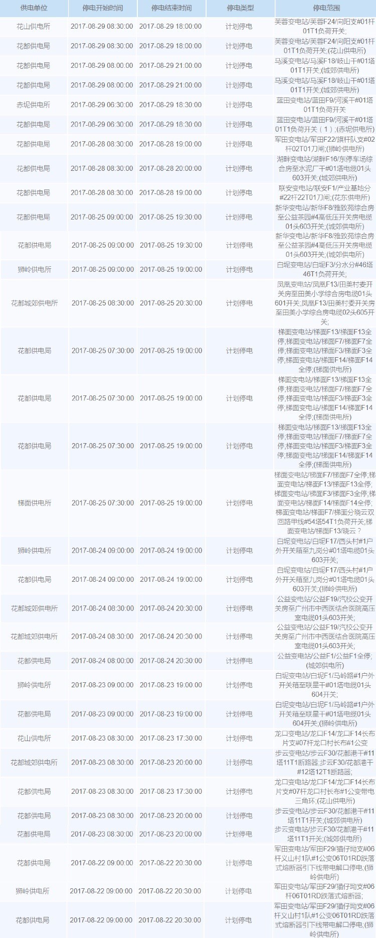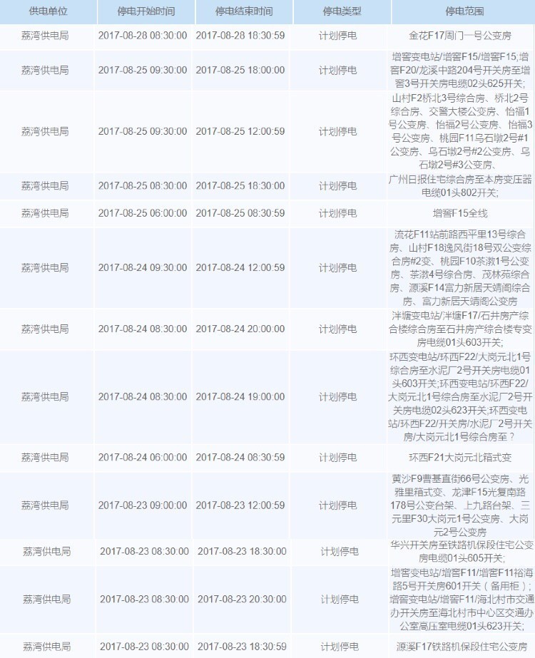 未来一周广州计划停电安排如下