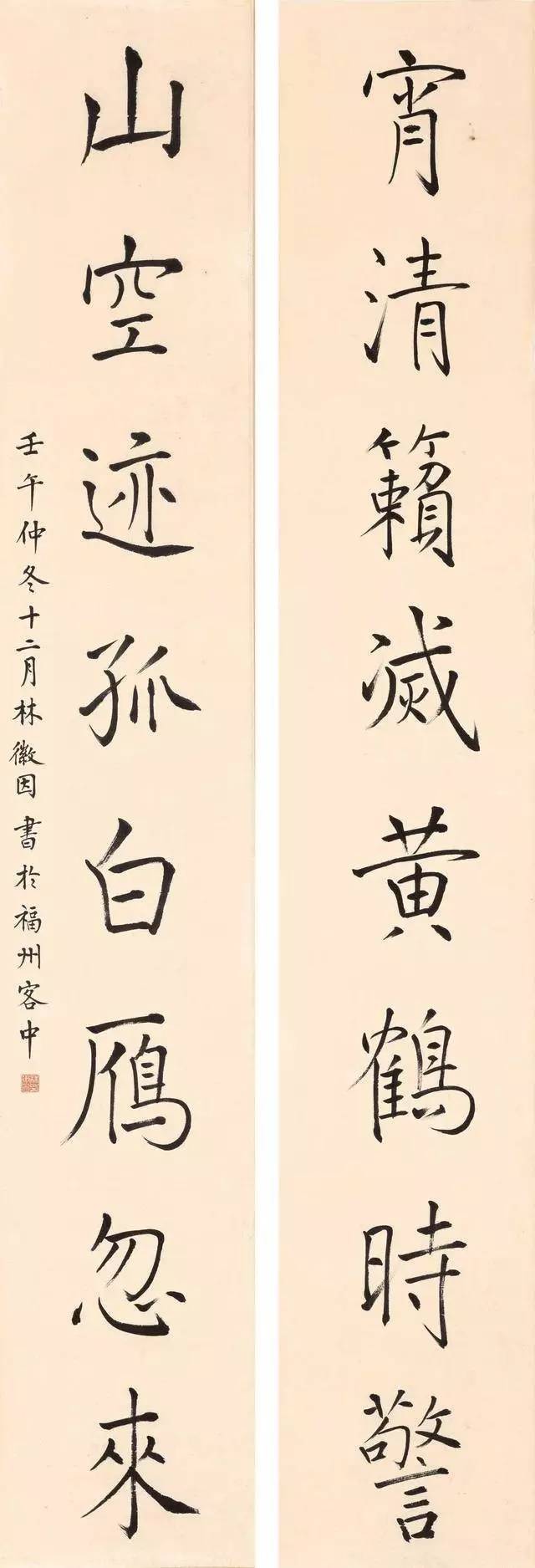 林徽因书于30多岁的对联“宵清籁灭黄鹤时警,山空迹孤白雁忽来”清灵飘逸,取法禇遂良。当时正面临着国破弟死,林徽因内心的哀伤从联文可辞知,然而褚字的“字里金生,行间玉润,法则温雅”的特点被林徽因很好地保留下来,并有着一种孤傲、高洁的性情,依稀可见其绝代风华。