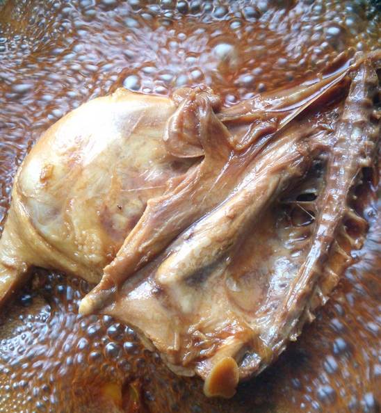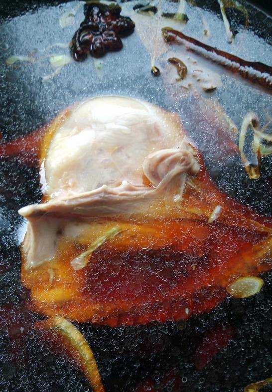 6. 大火收汁时加少许盐,留少许汤汁,盛出后用斩骨刀切块,浇汁即可