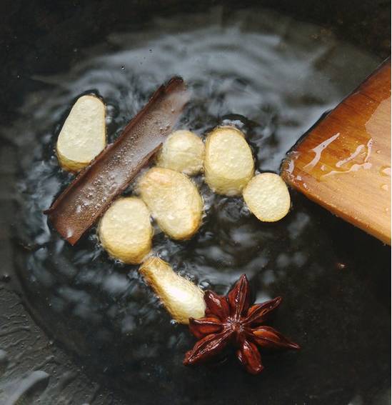 3. 热锅热油,爆香蒜片、八角和桂皮