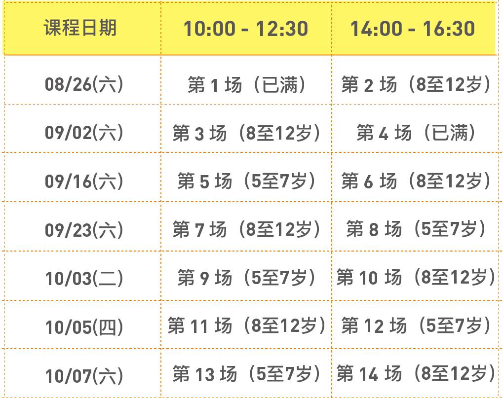 课程时间:每场课时2.5h,课程内容根据孩子接受能力有部分调整,整体内容一致,可选择一场参加。